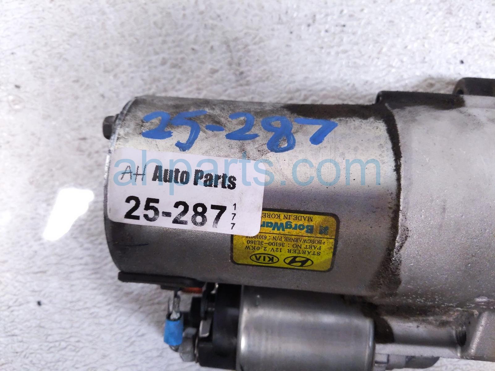 2021 Kia Telluride starter motor is a used item with a 1 year warranty. This OEM replacement starter motor is genuine and has part numbers 36100-3L160, and 361003L160. This Kia part sells for $100.