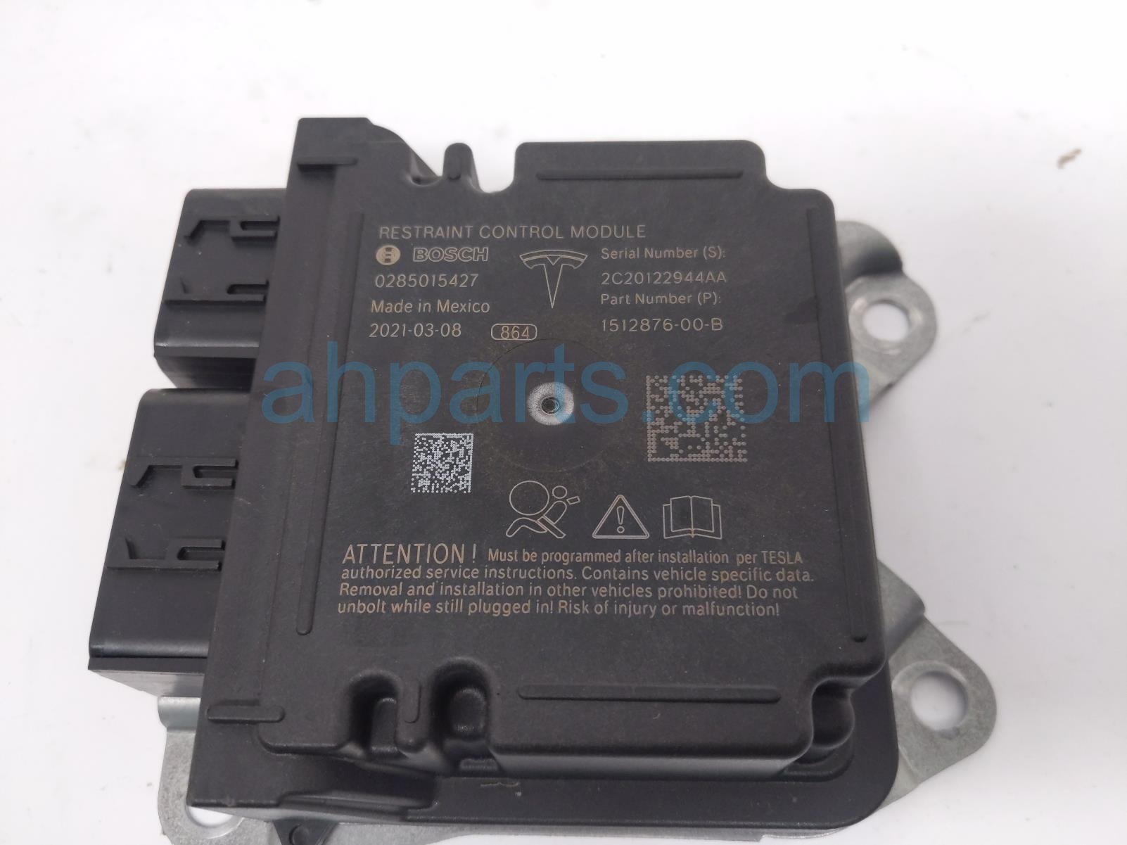 2021 Tesla Model Y srs airbag computer - 2 blown ab is a used item with a 1 year warranty. This OEM replacement srs airbag computer - 2 blown ab is genuine and has part numbers 1512876-00-B, and 151287600B. This Tesla part is for sale (please call for pricing).