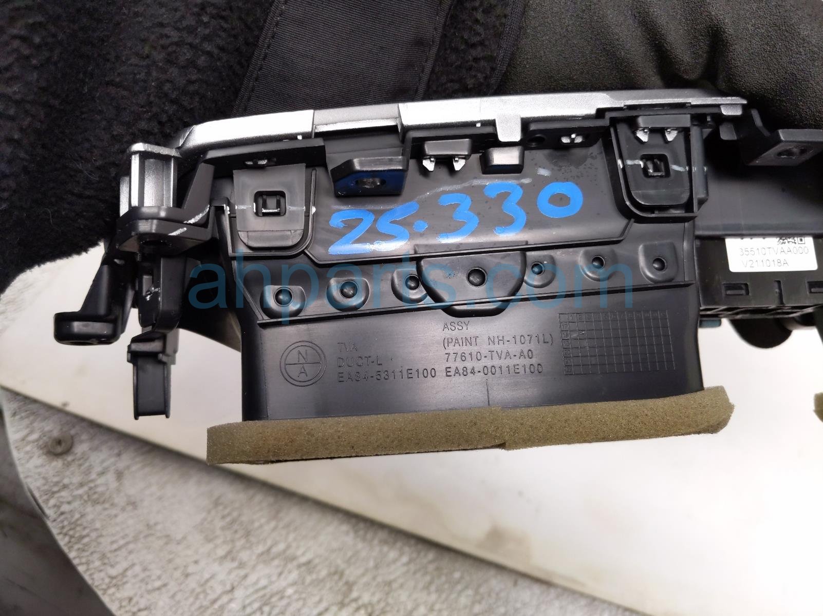 2022 Honda Accord center dash air vent outlet - blk is a used item with a 1 year warranty. This OEM replacement center dash air vent outlet - blk is genuine and has part numbers 77610-TVA-A01ZA, and 77610TVAA01ZA. This Honda part is for sale (please call for pricing).