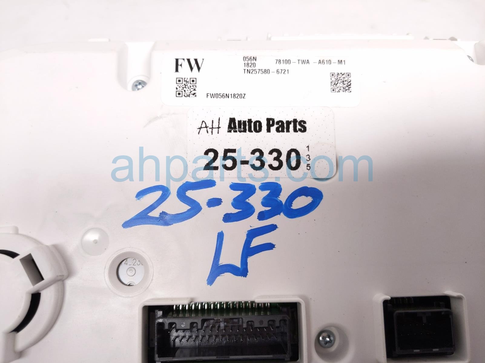 2022 Honda Accord speedometer / gauge speedo instrument cluster - 60k mi is a used item with a 1 year warranty. This OEM replacement speedometer / gauge speedo instrument cluster - 60k mi is genuine and has part numbers 78100-TWA-A61, and 78100TWAA61. This Honda part is for sale (please call for pricing). This item has the following note: 'Item has scratcheson lens and housing and a broken tab on housing.'