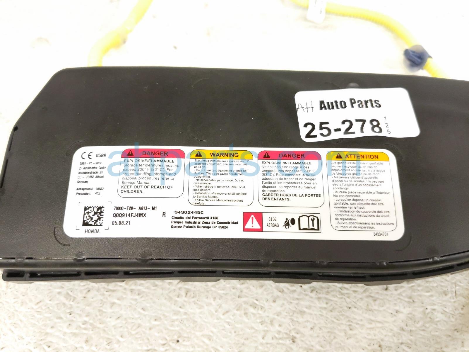 2022 Honda Civic passenger seat airbag is a used item with a 1 year warranty. This OEM replacement passenger seat airbag is genuine and has part numbers 78050-T20-A80, and 78050T20A80. This Honda part is for sale (please call for pricing).