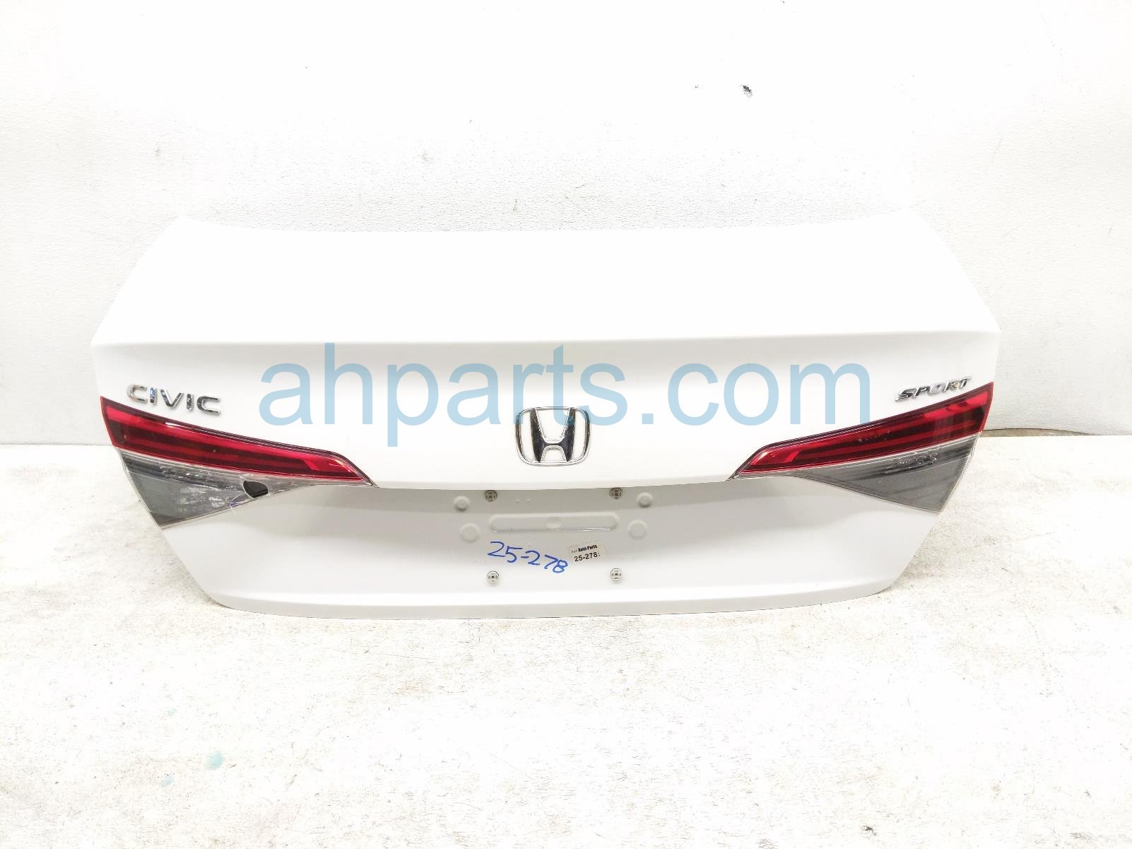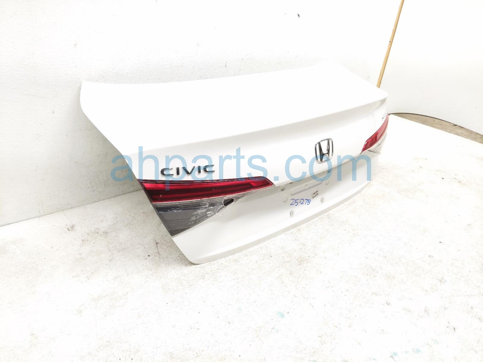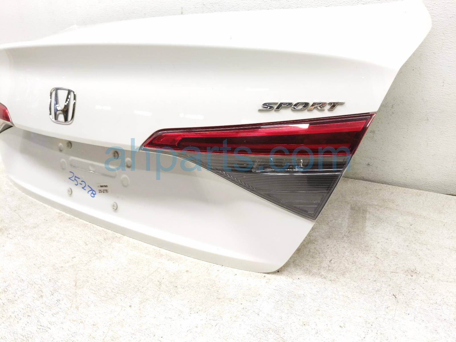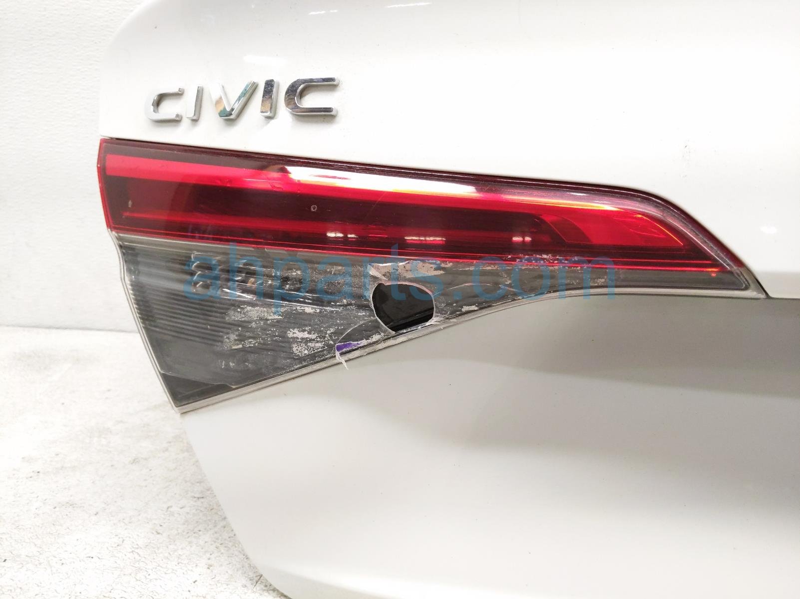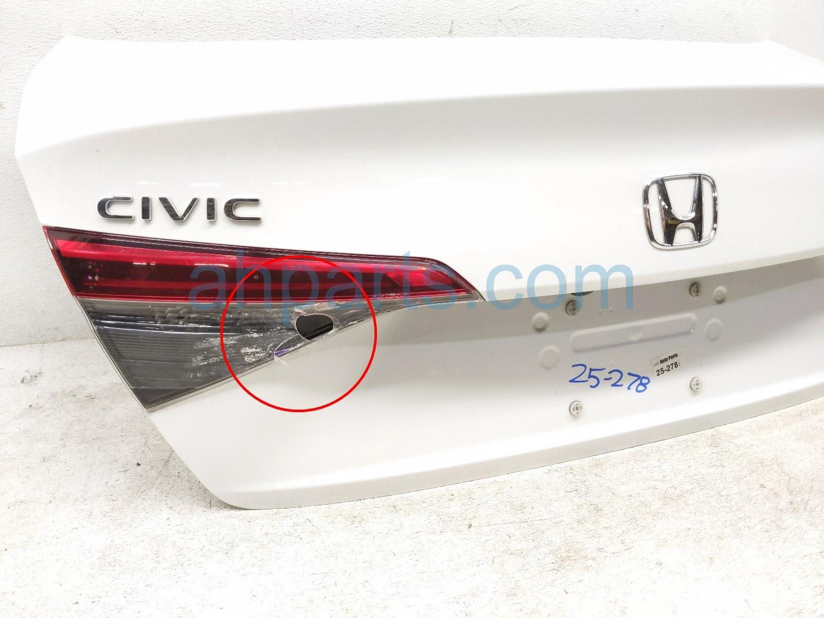 2022 Honda Civic trunk / decklid - white is a used item with a 1 year warranty. This OEM replacement trunk / decklid - white is genuine and has part numbers 68500-T20-A00ZZ, 68500T20A00ZZ, 74851-T20-003, 74851T20003, 34150-T20-A01, 34150T20A01, 39530-T20-A11, and 39530T20A11. This Honda part sells for $900. This item has the following note: 'Left inner tail lamp is cracked.'