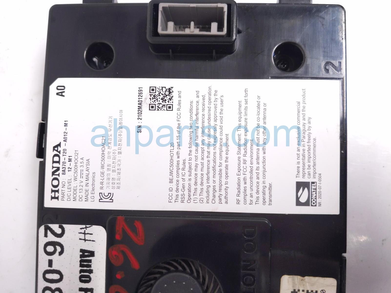 2022 Honda Civic wireless phone charger assy is a used item with a 1 year warranty. This OEM replacement wireless phone charger assy is genuine and has part numbers 8A370-T20-A01, and 8A370T20A01. This Honda part is for sale (please call for pricing).