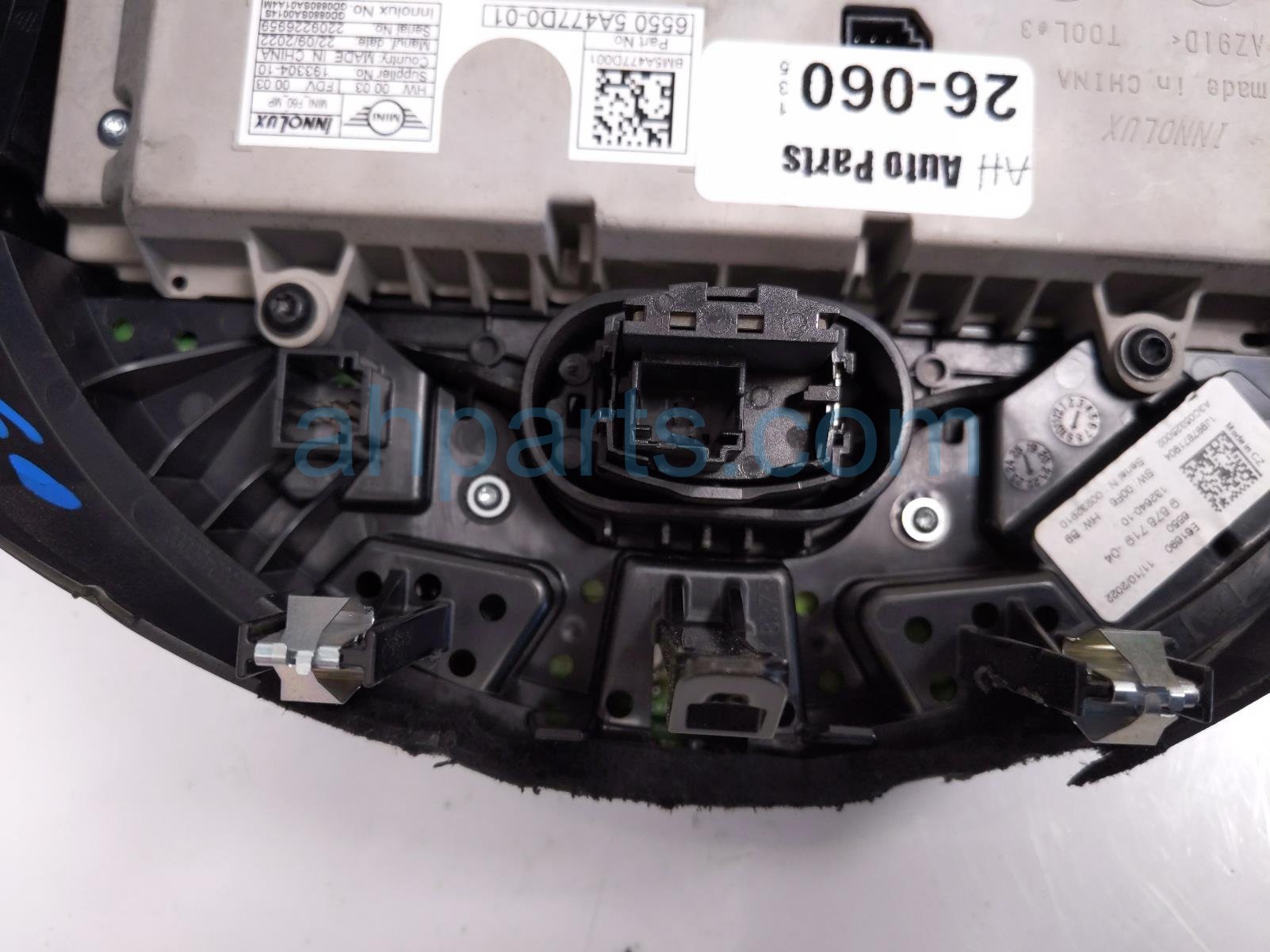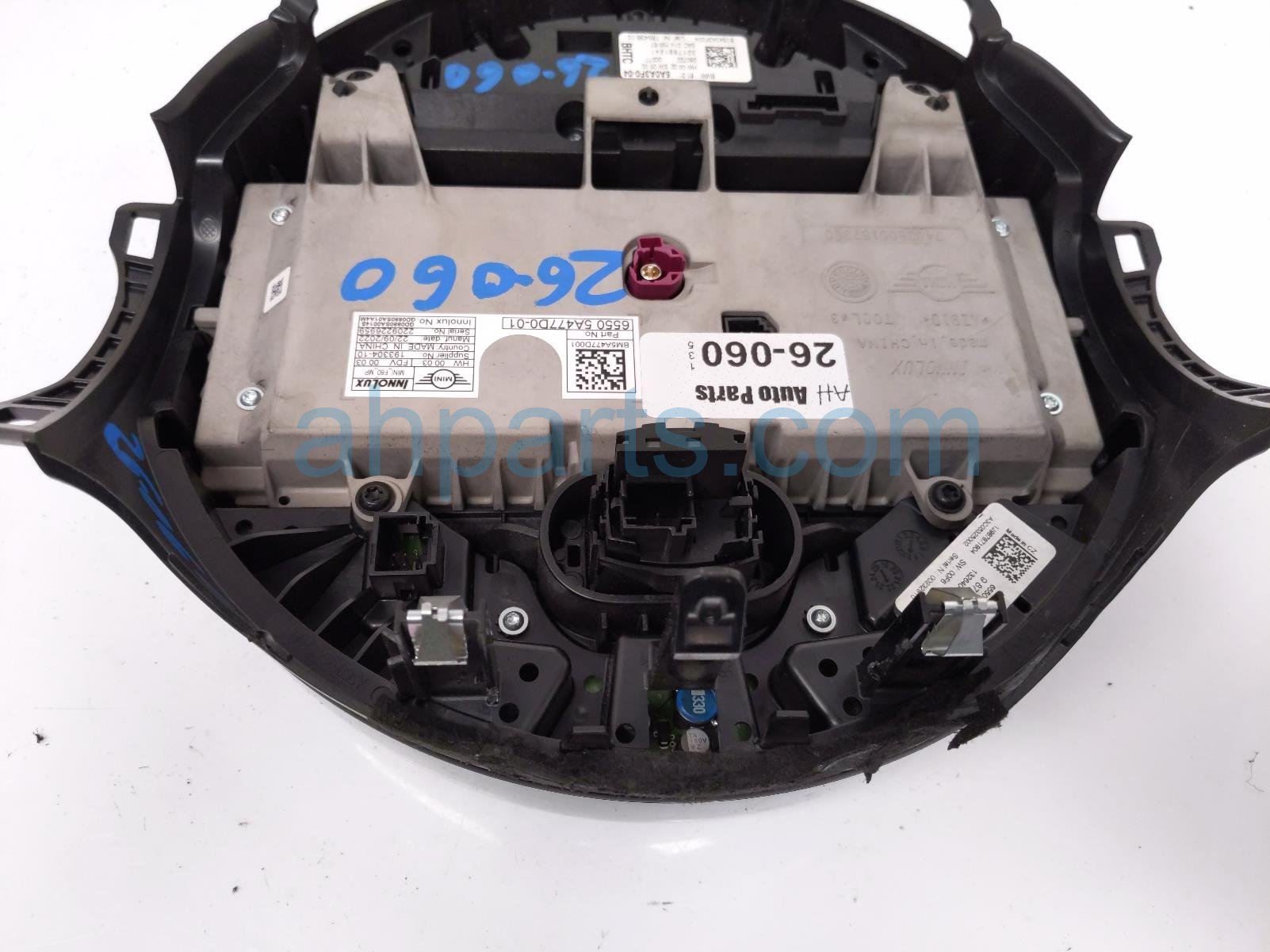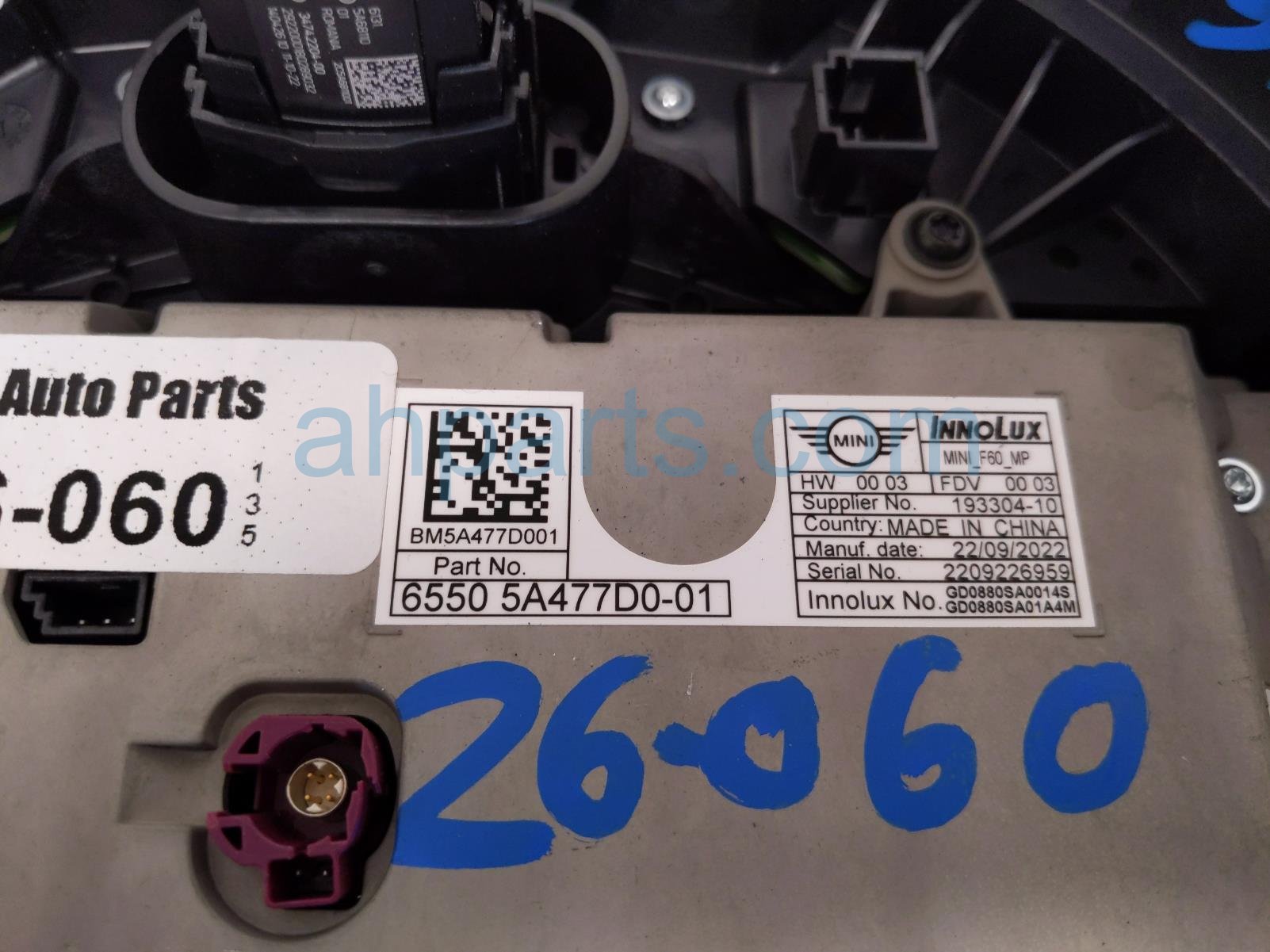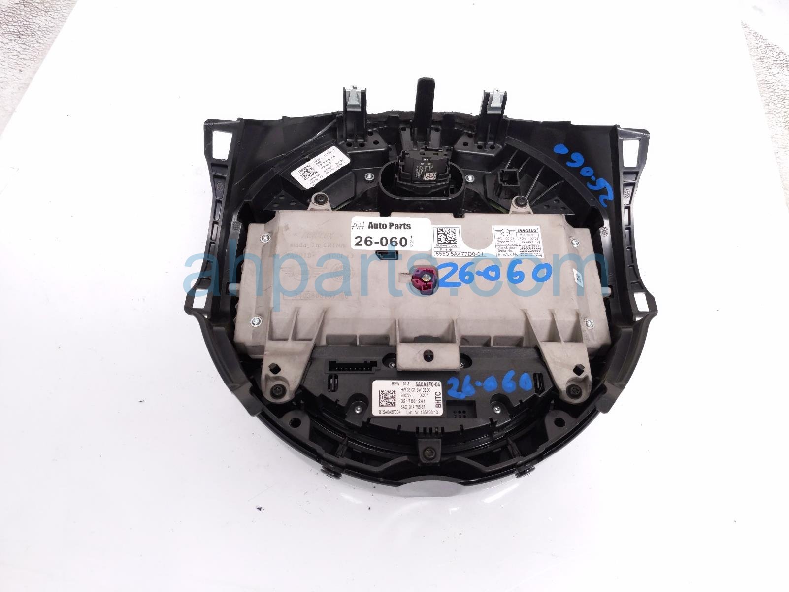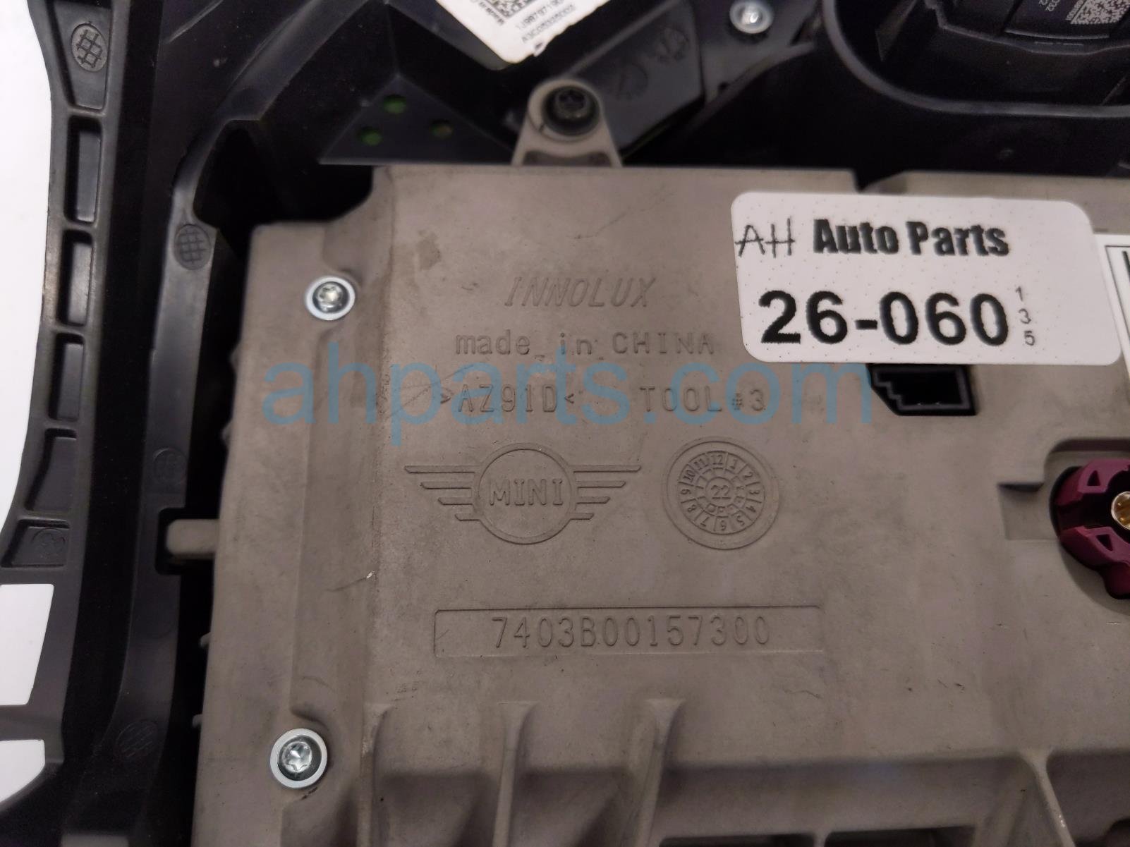 2023 BMW Mini Cooper upper display screen w/controls is a used item with a 1 year warranty. This OEM replacement upper display screen w/controls is genuine and has part numbers 65-50-5-A47-7D0, and 65505A477D0. This BMW part is for sale (please call for pricing). This item has the following note: 'This item has a crack in the frame of the assembly.'