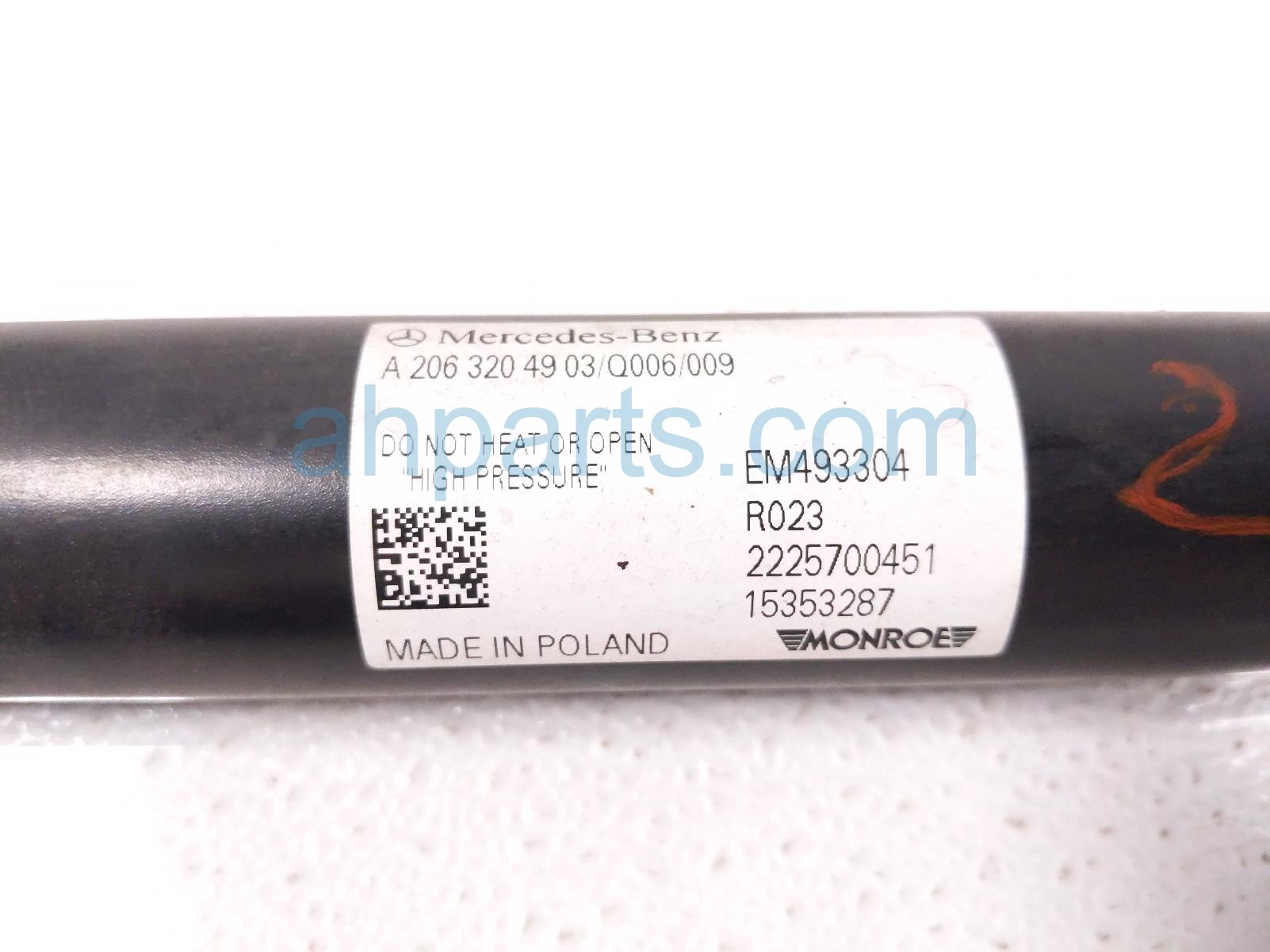2023 Mercedes C300 strut spring rear driver shock absorber is a used item with a 1 year warranty. This OEM replacement strut spring rear driver shock absorber is genuine and has part numbers 206-320-49-03, and 2063204903. This Mercedes part sells for $145.