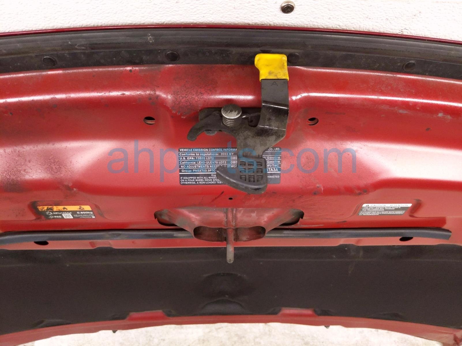 2023 Nissan Pathfinder hood - red is a used item with a 1 year warranty. This OEM replacement hood - red is genuine and has part numbers 65100-6TA5A, and 651006TA5A. This Nissan part is for sale (please call for pricing). This item has the following note: 'This item has a ding.'