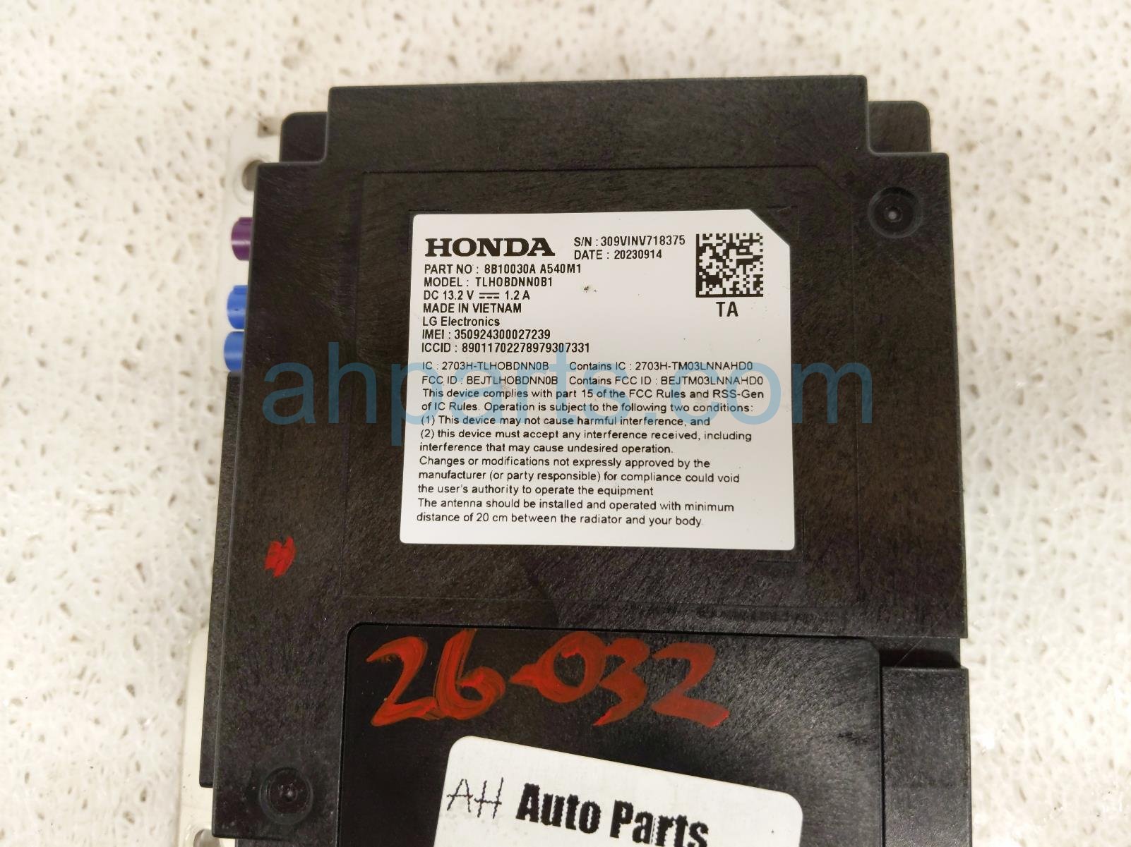 2024 Honda Accord telematics communication module is a used item with a 1 year warranty. This OEM replacement telematics communication module is genuine and has part numbers 8B100-30A-A54, and 8B10030AA54. This Honda part is for sale (please call for pricing).