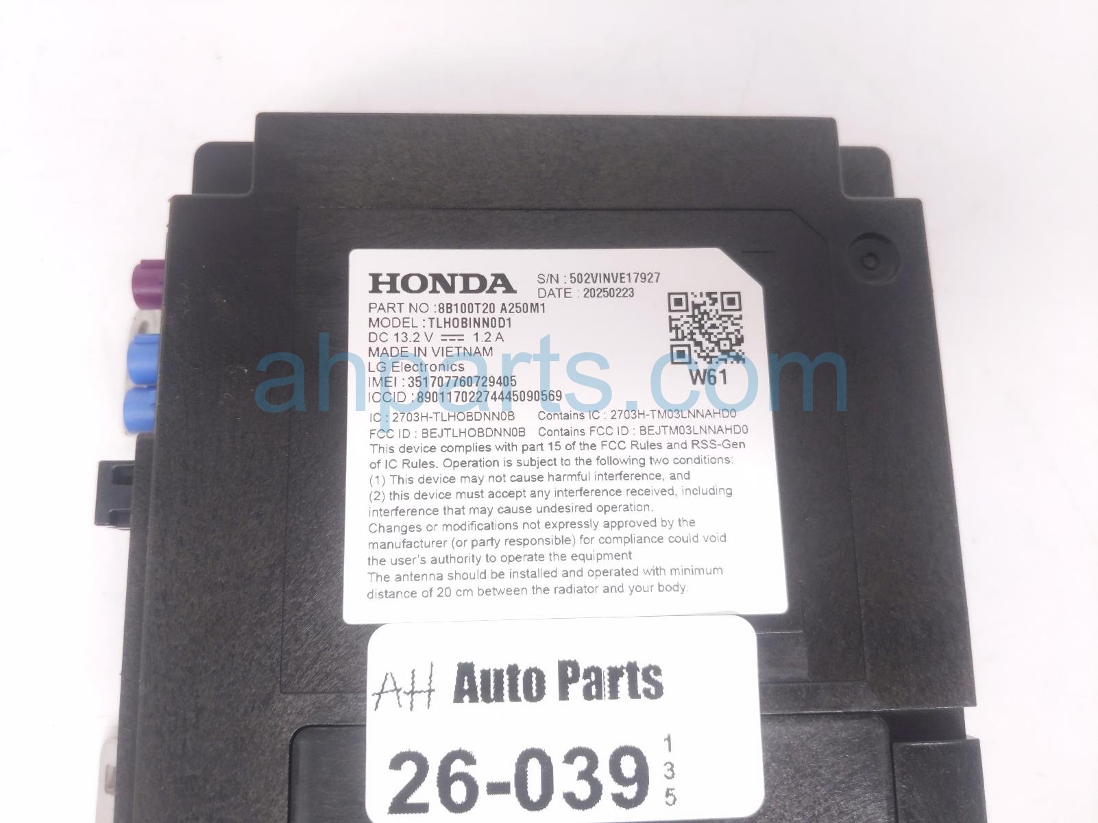 2025 Honda Civic telematics transceiver control unit is a used item with a 1 year warranty. This OEM replacement telematics transceiver control unit is genuine and has part numbers 8B100-T20-A25, and 8B100T20A25. This Honda part is for sale (please call for pricing).