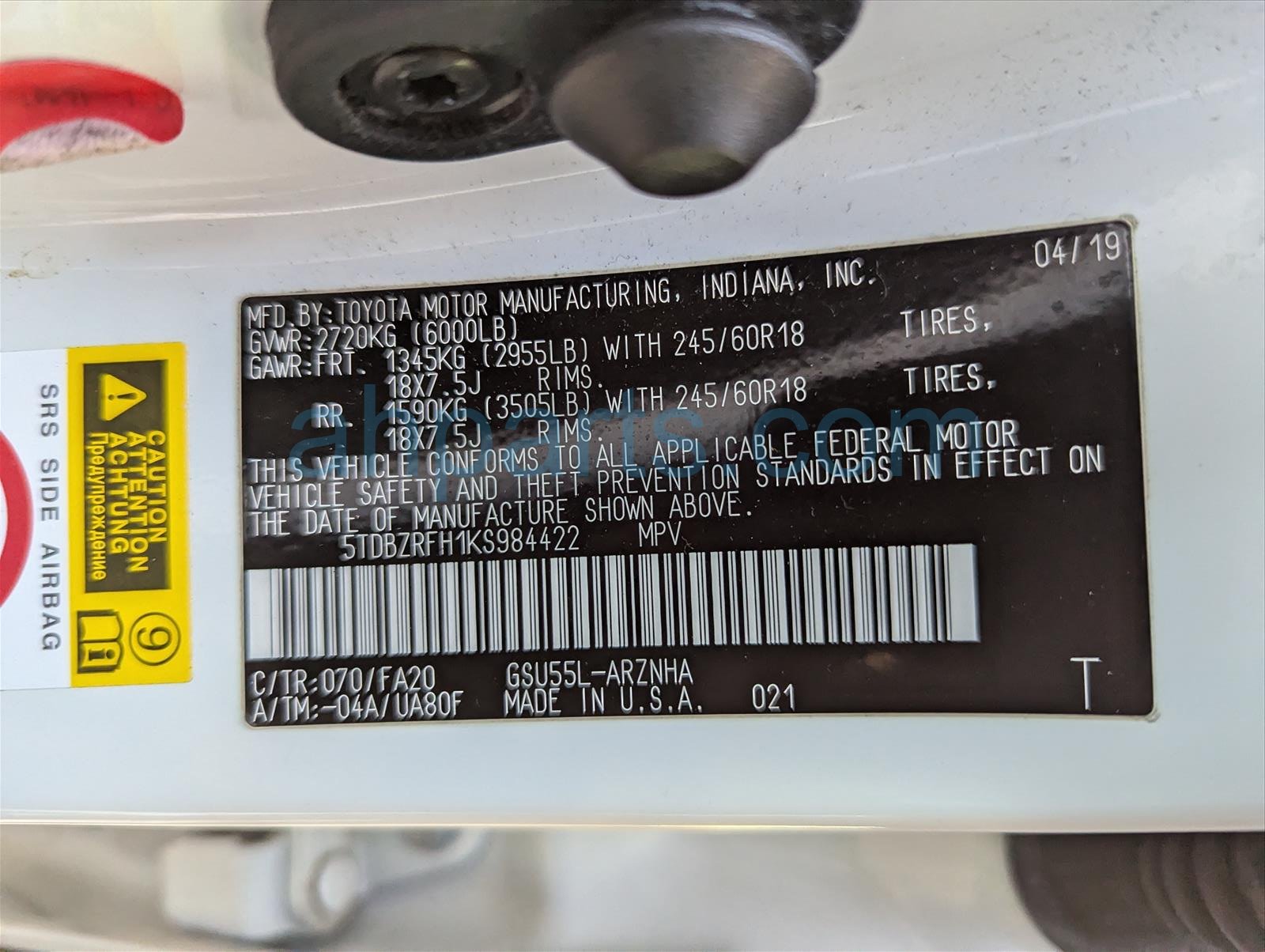 Car 26-047-3 - 2019 Toyota Highlander SUV 4 Door
